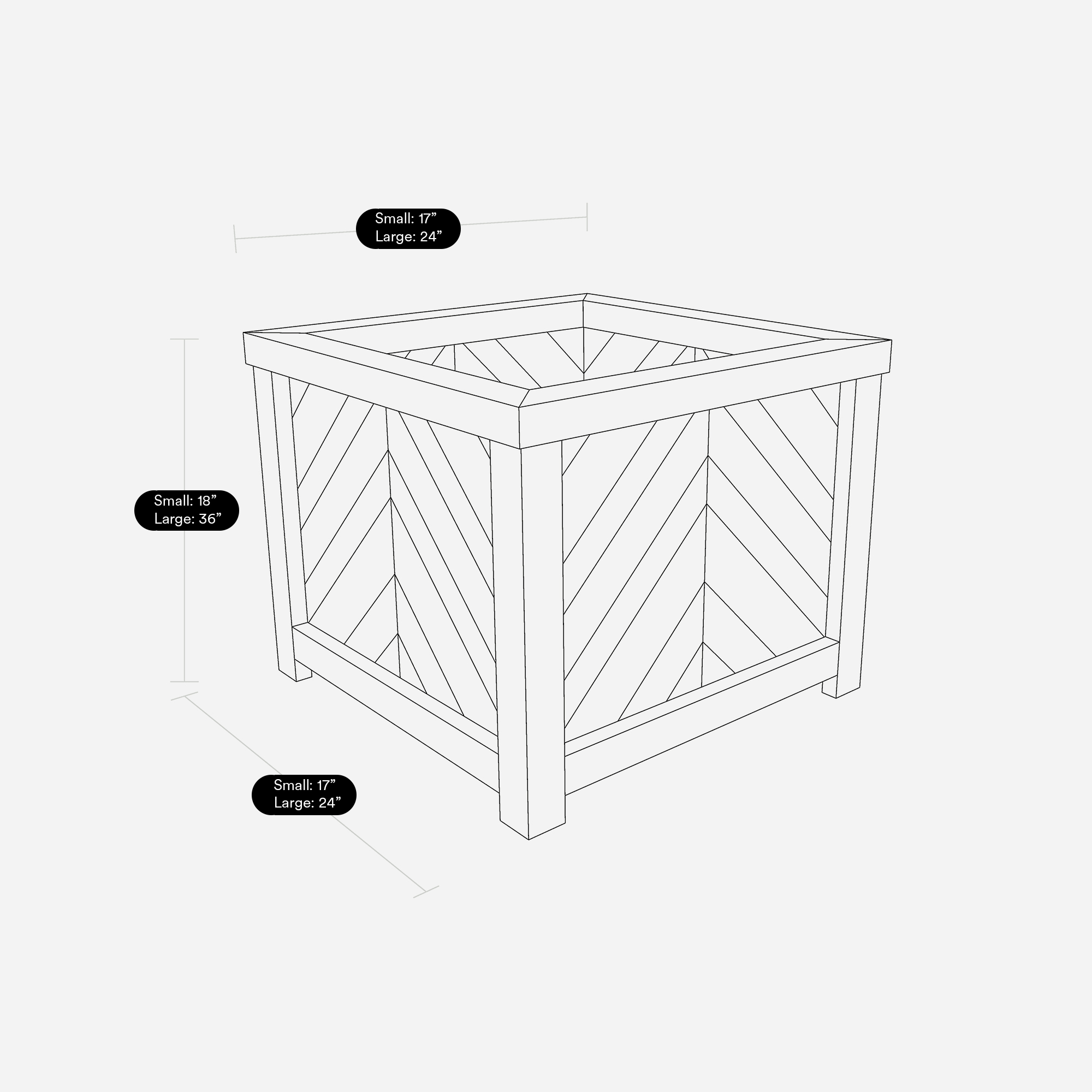 Small W: 17" D: 17" H: 18" Large W: 24" D: 24" H: 36"